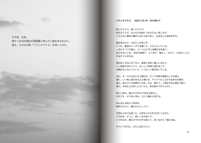 この本は、高橋歩が約2ヶ月間、愛車のJEEPで日本を放浪しながら綴った旅ノートだ。世界中を飛び回っていた高橋歩は、こんなことを言っていた。「オレは、世界を旅すればするほど、日本が好きになった。ここらで、もう一度、自分の生まれ育った国である日本をじっくりと感じてみたいんだよね」。そして、そんな想いが抑えきれなくなり、飛び出すように、ひとり旅に出て行った。沖縄の自宅から北海道の釧路まで、コースも決めず、ナビも付けず、ただ、自分のワクワクセンサーに導かれるまま、漂った自由時間…。旅を終え、本の中にこう綴った。