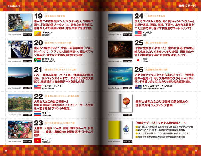 広告の縛りゼロで、自分たちの感性で自由に創る、インディペンデントな旅ガイドの第3弾。今回のテーマは、ズバリ、「愛する人との自由な旅」。人生の中で、これにまさる幸せな時間は、あまりないでしょ!そんなイメージから、世界を遊び続けている旅仲間の総力を挙げて、最高のガイドの制作は始まった。しかし、巷に溢れる「カップルでの旅」というと、大半が南の島でのリゾートなイメージ。制作チーム内で、「リゾート以外にもカップルで行くべき旅は沢山あるはずだ!」と、バラエティに溢れるカップルガイドを作ることに挑戦することに。しかし調査難航。本当に苦労した!だって、本当にリゾートの情報しか出てこないから。でも探し続けたら、いろいろと出てくるものです。「秘境アマゾンをこんなゴージャスな船で?!」や「やっぱりオーロラはふたりで見たいよね!」、はたまた意外な「大自然溢れる所に、こんなロマンチックな宿が?!」と、驚くほど楽しそうで、でもロマンチックな空間が並んだ。若いカップルから、熟年の老夫婦まで、愛し合うふたりならば、年齢・趣味を問わず楽しめるであろう、極上のデート旅が集まったのです。もちろん、旅の予算の内訳から、旅の手配の方法、交通手段、現地での注意点などまで、実際に旅をするうえで必要な情報も、しっかり網羅!さぁ、愛する人と自由な旅を。LOVE&FREE…